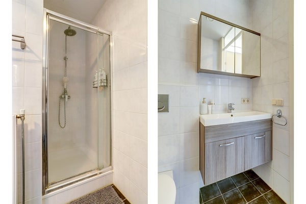 De badkamer is volledig betegeld en voorzien van neutrale kleurtinten. Hier geniet je van een fijne douche, wastafelmeubel met wasbak en natuurlijk een toilet. Ook beschikt de badkamer over een handige radiator.