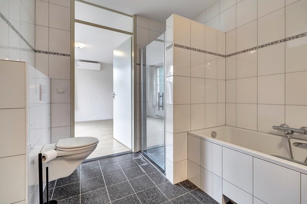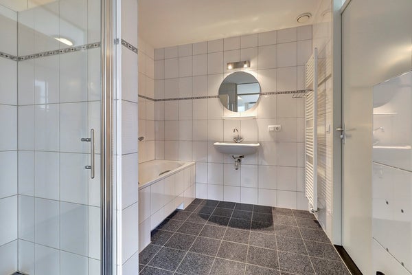 Via het achterportaal als via de slaapkamer bereik je de royale badkamer. De ruimte is volledig betegeld en biedt alles wat je nodig hebt: een ligbad om heerlijk in te ontspannen, een douche met glazen deur voor dagelijks gemak, een wastafel, een hangcloset en een designradiator voor warme handdoeken. Alles wat je zoekt om de dag goed te beginnen óf te eindigen.