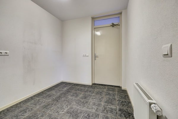 Vanuit de keuken kom je in het achterportaal, een praktische verbindingsruimte die toegang biedt tot de achtertuin, de inpandige berging, de badkamer en de slaapkamer op de begane grond.