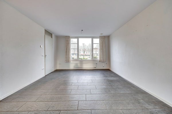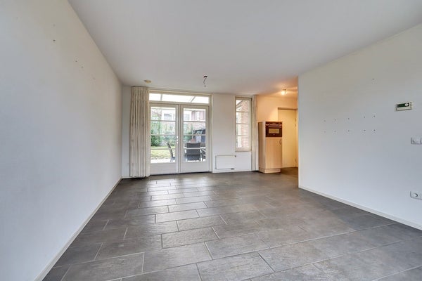 Vanuit de hal stap je de lichte doorzon woonkamer binnen. Dankzij de grote raampartijen aan de voorzijde geniet je van veel daglicht, terwijl de openslaande tuindeuren aan de achterzijde zorgen voor een mooie verbinding met de tuin. Binnen en buiten lopen hier dan ook prachtig in elkaar over. De woonkamer is royaal en biedt alle mogelijkheden voor een comfortabele zithoek én een gezellige eethoek. De afwerking is verzorgd met een neutrale tegelvloer voorzien van vloerverwarming, spachtelputz wanden en een strak stucwerk plafond.