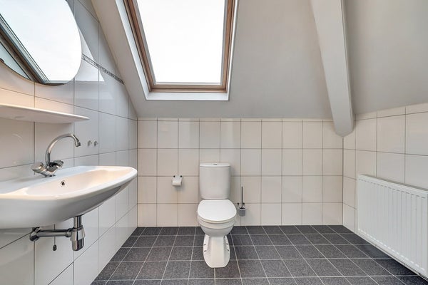 Ook op deze verdieping vind je een complete badkamer, volledig betegeld en voorzien van een inloopdouche, toilet en wastafel. Dankzij het dakraam geniet je hier van natuurlijk daglicht én ventilatie.