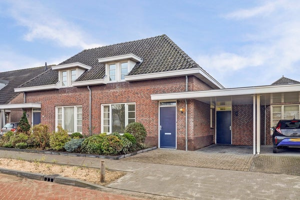 De voortuin is groen aangelegd en biedt een looppad met toegang tot de voordeur. Daarnaast beschikt de woning over een eigen oprit met carport en directe toegang tot de inpandige berging.