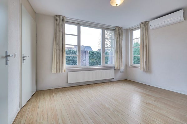 Aan de achterzijde van de woning bevindt zich de royale slaapkamer op de begane grond. Dankzij de grote raampartijen geniet je hier van veel natuurlijk licht en een prettig uitzicht op de achtertuin. De kamer is netjes afgewerkt en voorzien van een laminaatvloer, hardhouten kozijnen met dubbel glas, elektrische rolluiken en airconditioning. Vanuit hier heb je ook directe toegang naar de badkamer.
