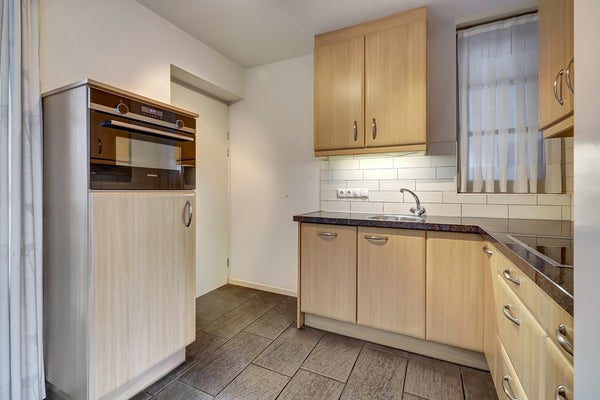 Aan de achterzijde van de woonkamer vind je de open keuken in praktische hoekopstelling. Dankzij de slimme indeling heb je alles binnen handbereik. De keuken is uitgerust met een vierpits inductiekookplaat, afzuigkap en een compacte vaatwasser. Daarnaast is er een losse kastenwand met een combi-oven en koelkast. De afwerking sluit naadloos aan bij de woonkamer.