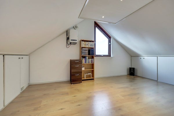 De grootste ruimte op deze verdieping is een zeer royale kamer die moeiteloos kan dienen als extra slaapkamer of hobbyruimte. Hier vind je tevens ook de zonnepanelen omvormer en aan beide zijde onder de dakschuinte is er extra opbergruimte gecreëerd.