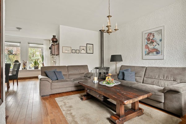 Z-vormige woonkamer met veel lichtinval en biedt meer dan voldoende ruimte aan een eet- en zithoek. De gezellige houtkachel blijft achter in de woning!