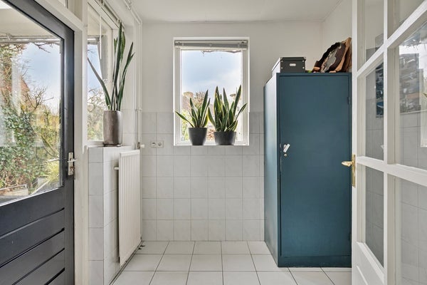 Halfhoog betegelde bijkeuken met stortbak voorzien van warm en koud water, deur naar overdekt terras.