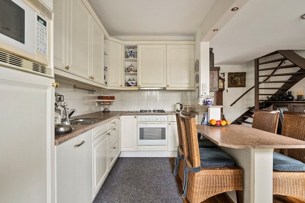 Open keuken met vaste ontbijttafel en inbouwkeuken in hoekopstelling voorzien van 1,5 rvs spoelbak, 4 pits gaskookplaat, oven, vaatwasser, magnetron en koelkast.