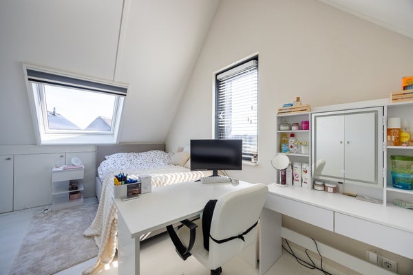De eerste verdieping omvat een royale overloop, twee slaapkamers, een grote master bedroom met inloopkast, en een complete badkamer. De tweede verdieping biedt nog twee ruime slaapkamers en extra bergruimte.