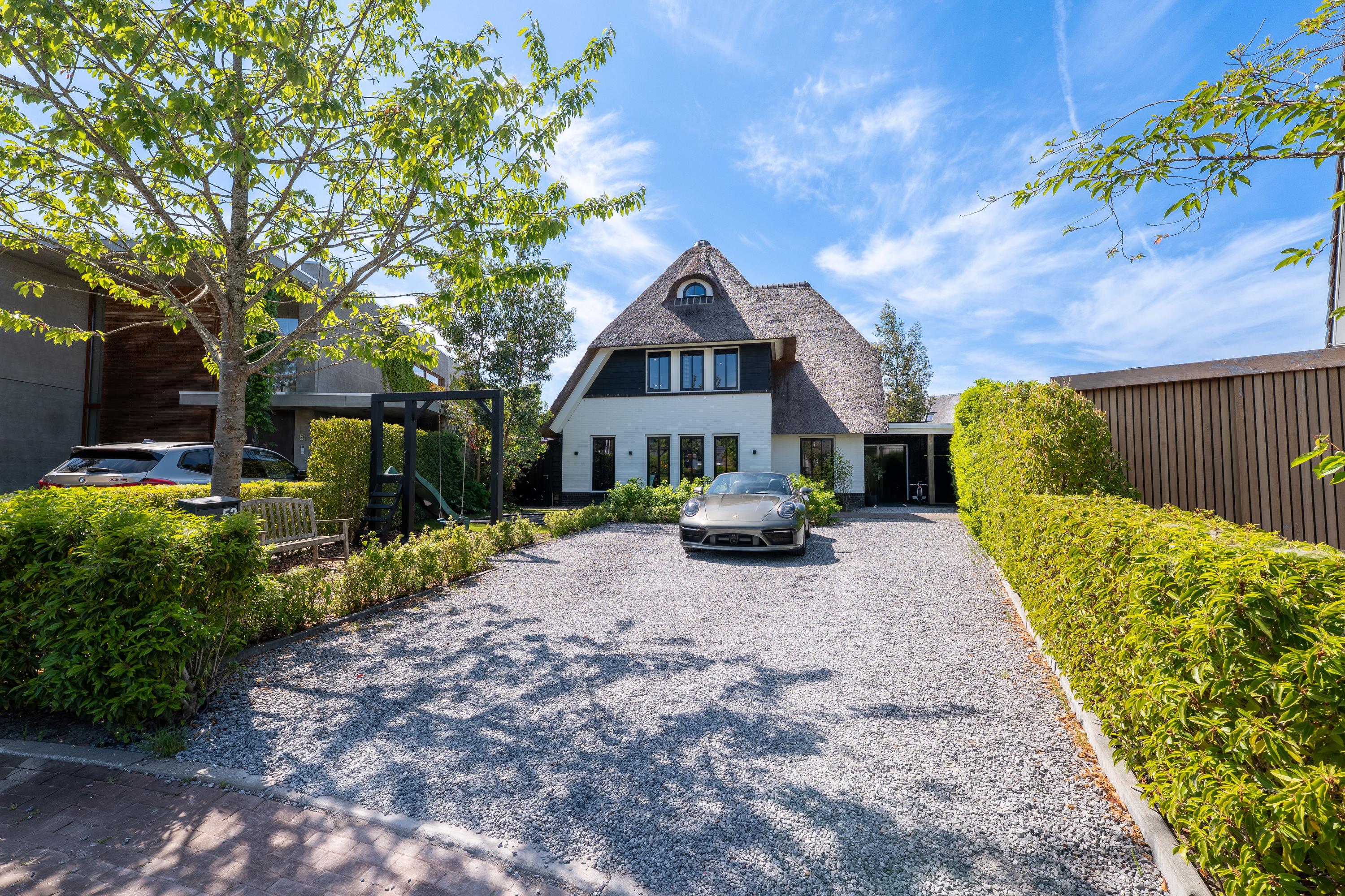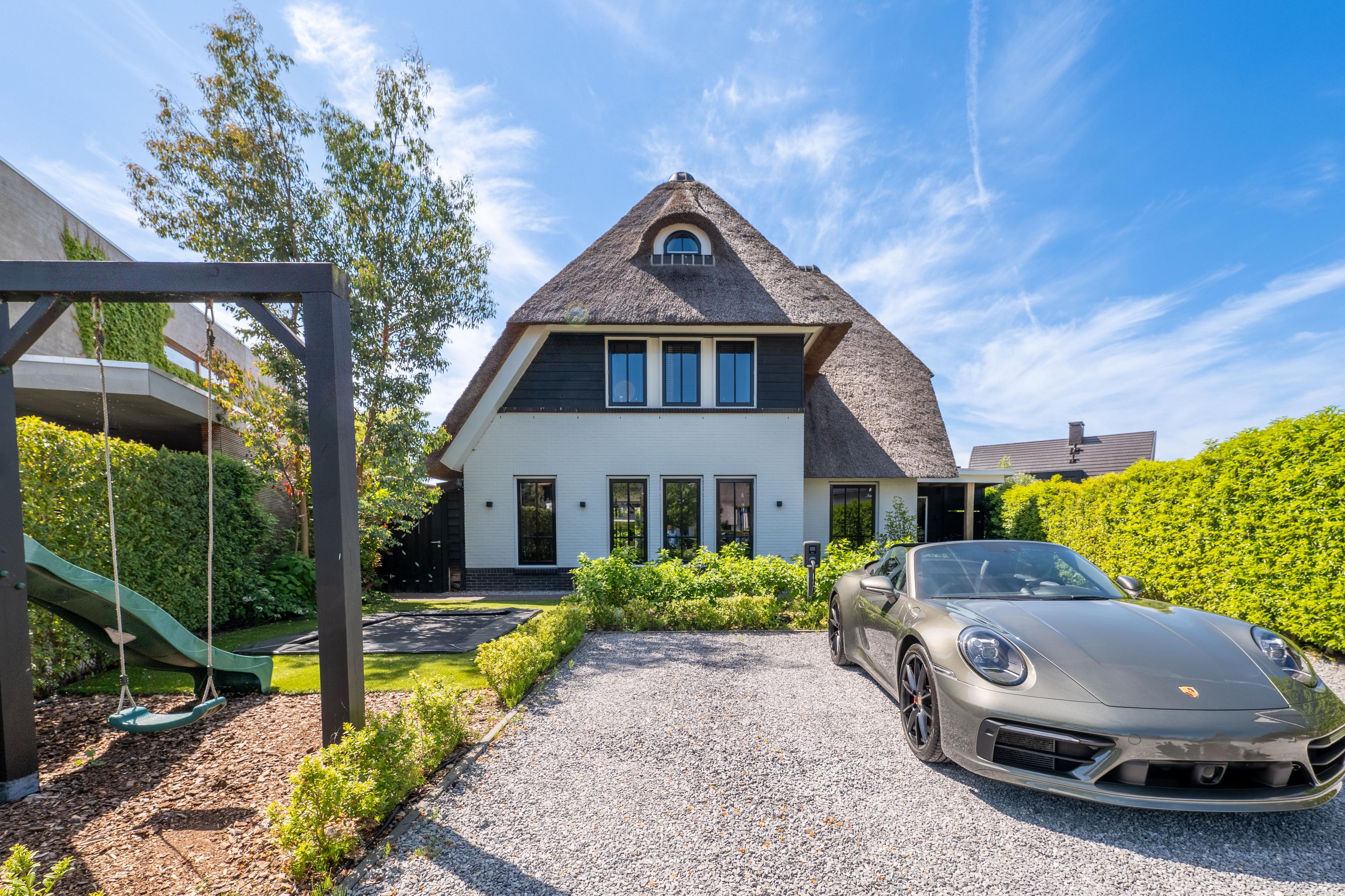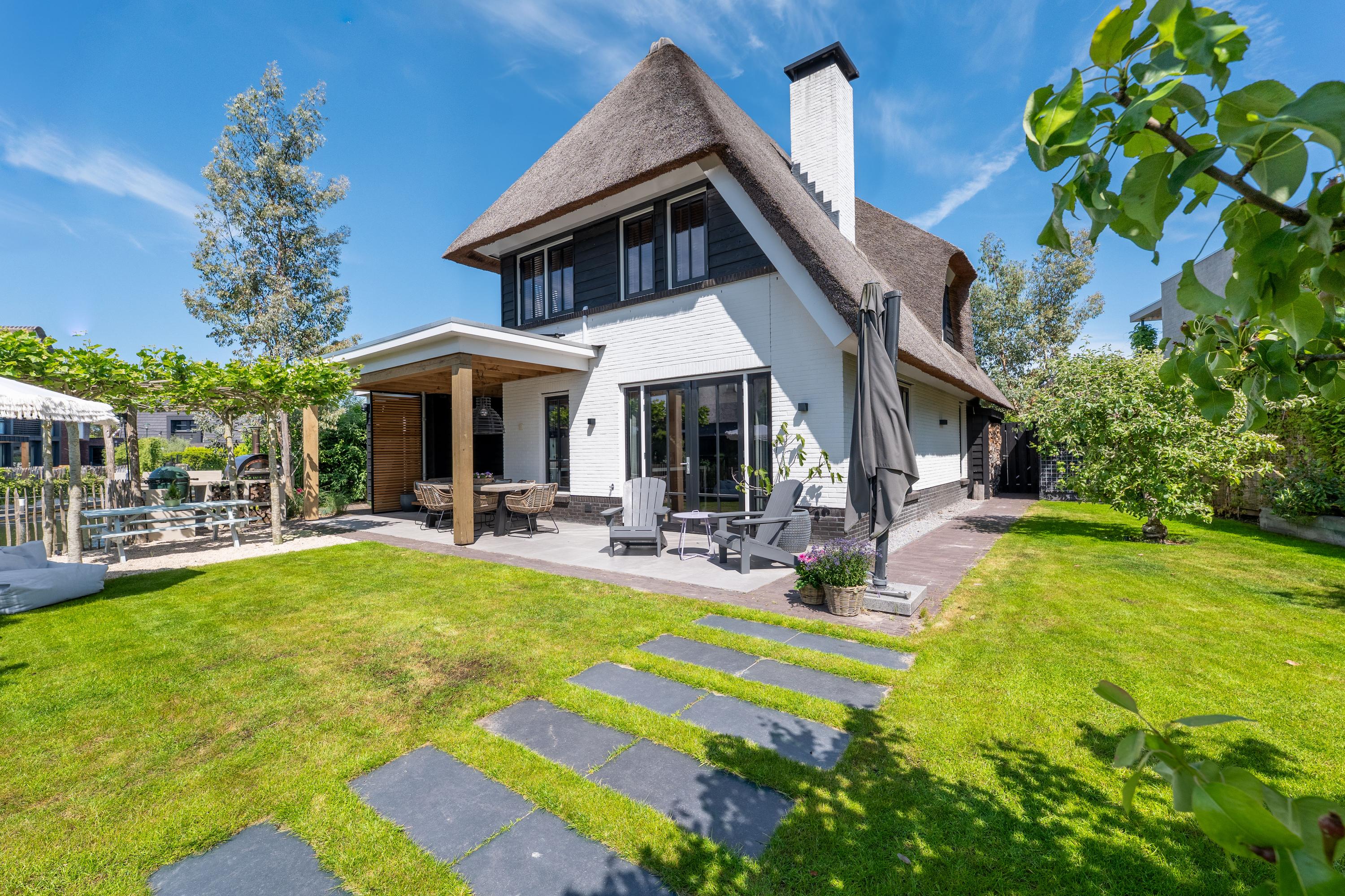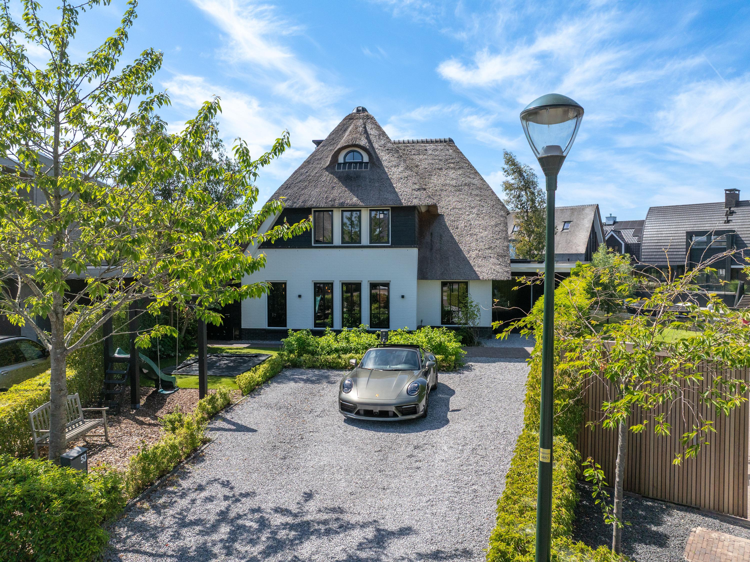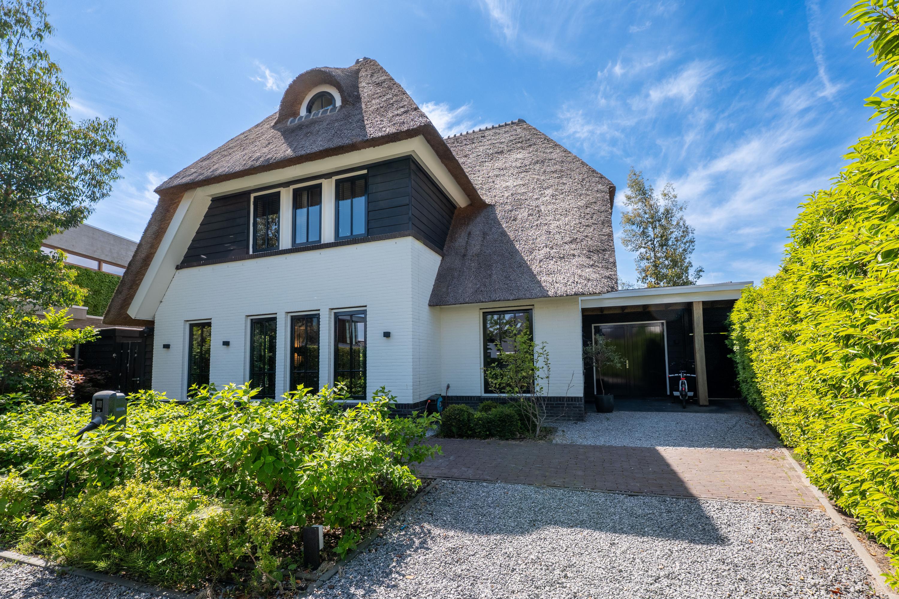 Deze schitterende rietgedekte villa in Blaricum, aan het water, biedt een uniek gevoel van vakantie. De woning beschikt over een ruime oprit en veranda en is gelegen op een eiland met eigen aanlegplaatsen aan recreatief water. Binnen komt u via de overdekte entree in de hal die leidt naar de bijkeuken en een voormalige garage. De ruime woonkamer met open haard gaat over in de eetkeuken, compleet met moderne apparatuur en openslaande deuren naar het terras. De eerste verdieping heeft drie slaapkamers en een luxe badkamer. Op de tweede verdieping zijn nog twee kamers. De woning is volledig geïsoleerd, met vloerverwarming en koeling. De tuin rondom is verzorgd en biedt parkeermogelijkheid voor drie auto’s. Dit is een unieke kans om direct aan vrij vaarwater te wonen.