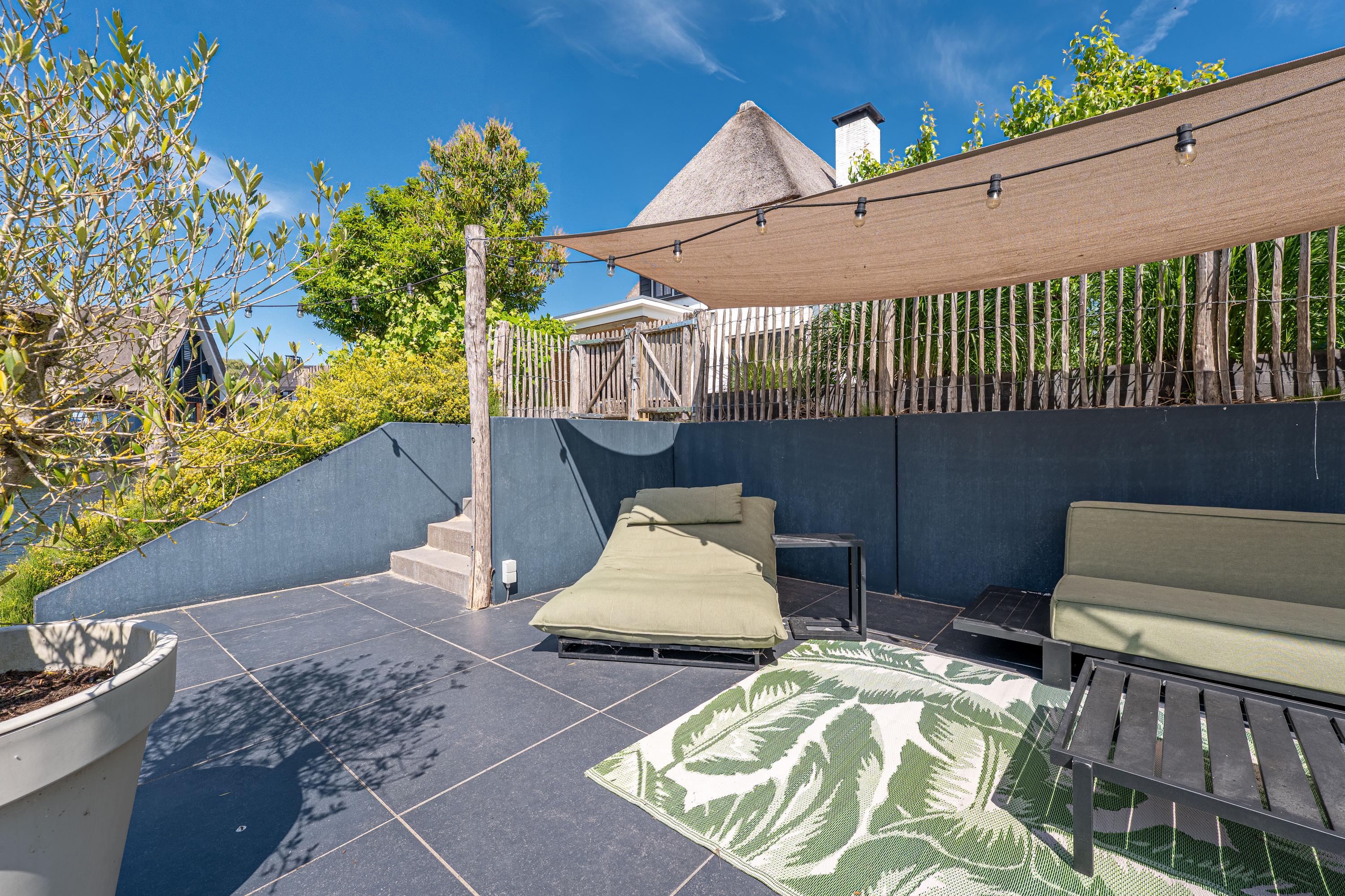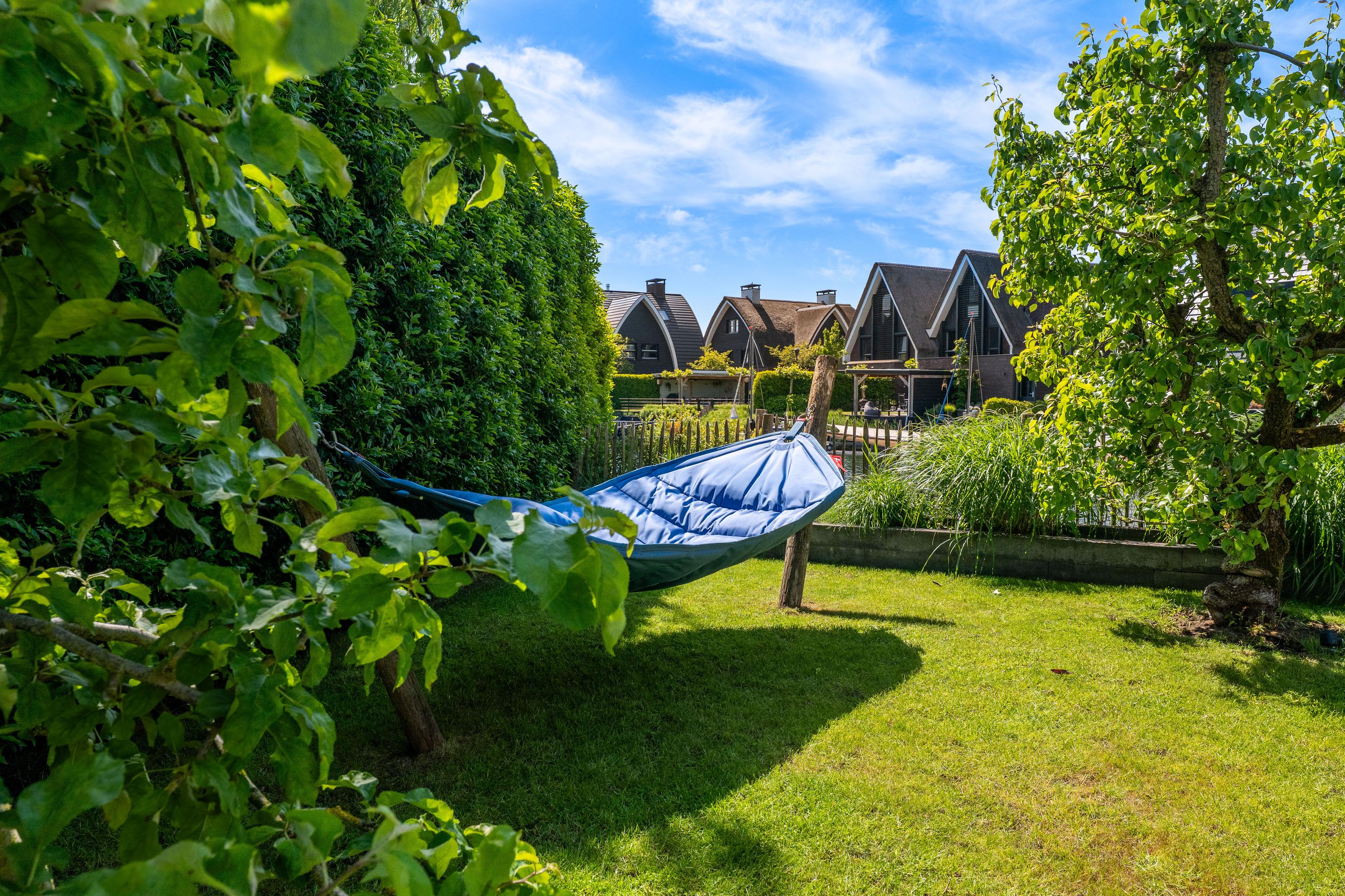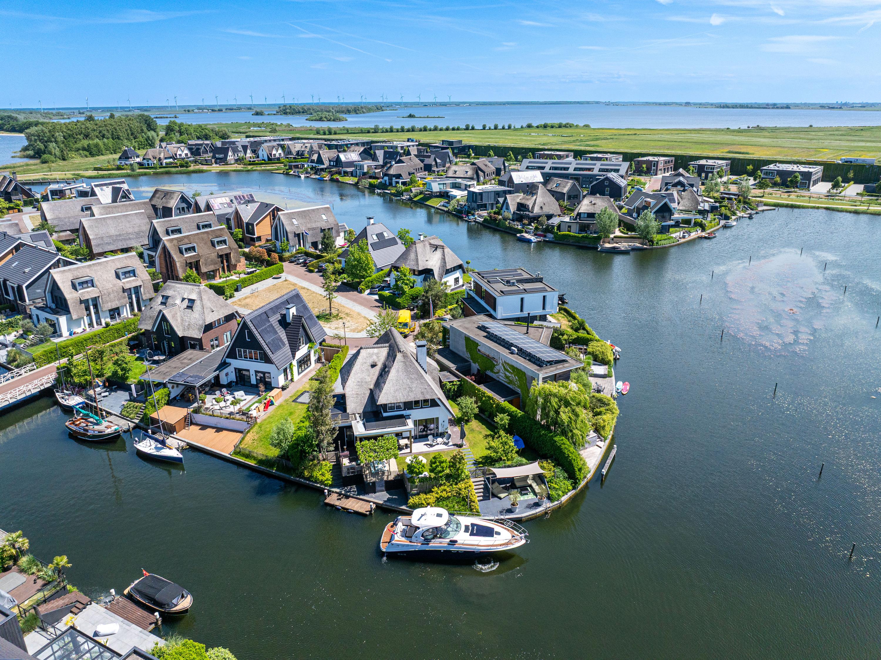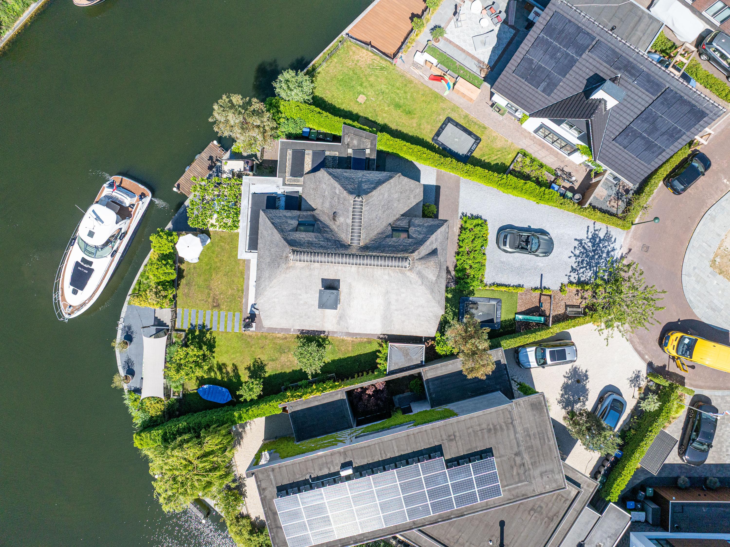 Deze schitterende rietgedekte villa in Blaricum, aan het water, biedt een uniek gevoel van vakantie. De woning beschikt over een ruime oprit en veranda en is gelegen op een eiland met eigen aanlegplaatsen aan recreatief water. Binnen komt u via de overdekte entree in de hal die leidt naar de bijkeuken en een voormalige garage. De ruime woonkamer met open haard gaat over in de eetkeuken, compleet met moderne apparatuur en openslaande deuren naar het terras. De eerste verdieping heeft drie slaapkamers en een luxe badkamer. Op de tweede verdieping zijn nog twee kamers. De woning is volledig geïsoleerd, met vloerverwarming en koeling. De tuin rondom is verzorgd en biedt parkeermogelijkheid voor drie auto’s. Dit is een unieke kans om direct aan vrij vaarwater te wonen.
