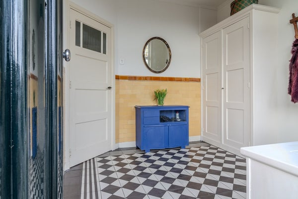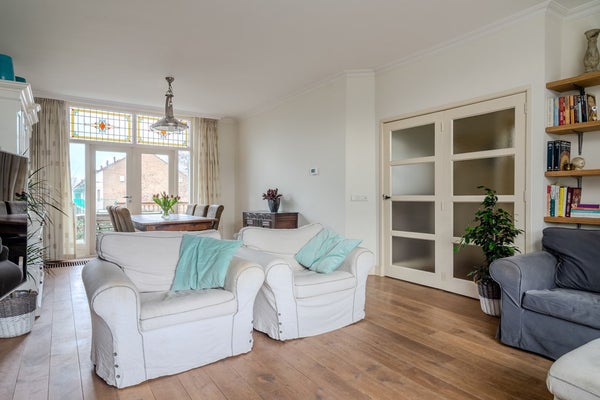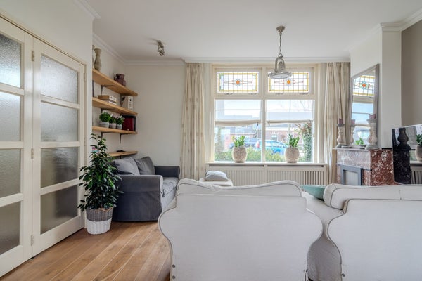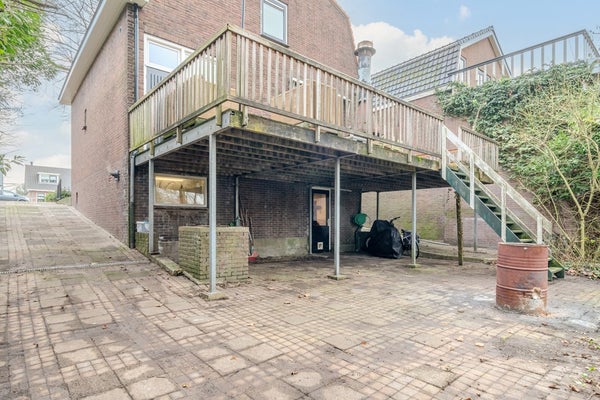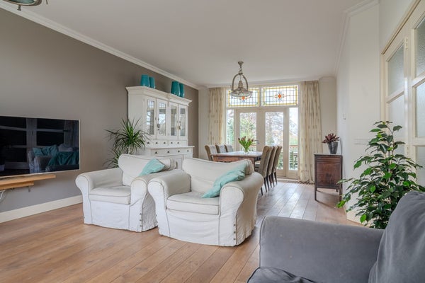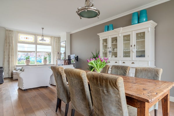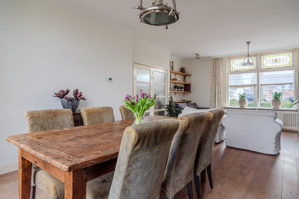 De auto parkeer je met gemak in de voor- of zijtuin. Bij binnenkomst via de voorzijde van de woning kom je in het tochtportaal (2.87 x 2.75) met meterkast. Ideaal voor een grote garderobe of schoenenkast. De navolgende gang geeft je toegang tot de living, keuken en het toilet. De lichte doorzonwoonkamer (4.49 x 7.80) is heerlijk ruim en voorzien van een houten afwerkvloer en dubbele deuren naar het balkon aan de achterzijde van de woning. Zo wel hier als in het tochtportaal vind je glas-in-lood ramen. De gesloten keuken (3.80 x 3.44) is heerlijk ruim, maar wel aan vervanging toe. Vanaf hier kun je met een enkele deur ook het balkon op. Het balkon aan de achterzijde (9.02 x 4.22) is op het westen gelegen en geeft je een fijn ruimtelijk gevoel. Met mooi weer kun je hier perfect relaxen of dineren aan een grote tafel. Vanuit de keuken kun je de trap pakken naar de kelder en naar de eerste verdieping.