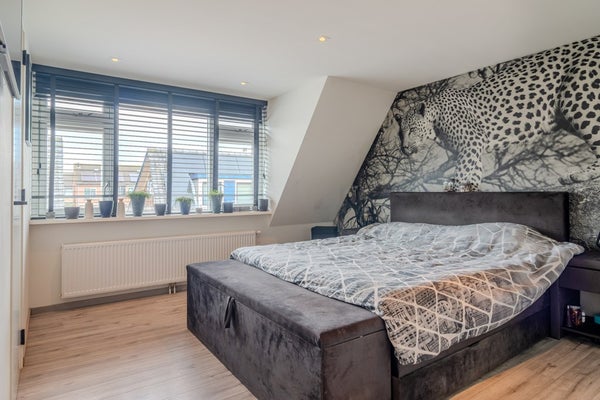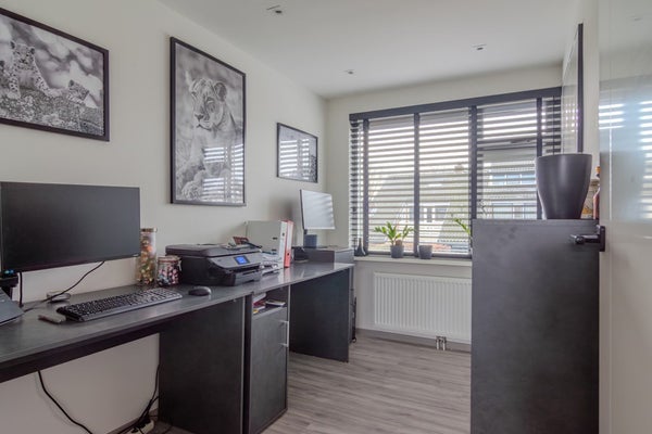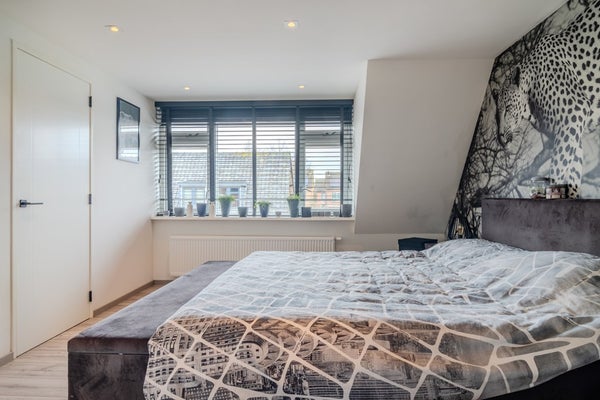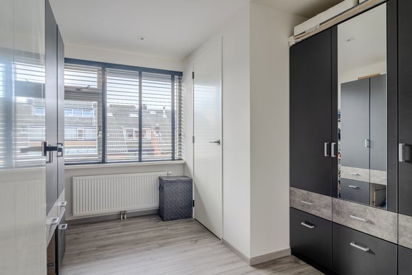 Via de open trap in de woonkamer kom je op de kleine overloop direct bij de deur naar alle vertrekken op de eerste verdieping. De hoofdslaapkamer (3.57 x 3.99) is aan de voorzijde gelegen en is voorzien van een dakkapel en airco. Vanuit hier heb je toegang tot de twee slaapkamers aan de achterzijde (3.22 x 2.02 en 3.22 x 3.06). Waarvan er nu één in gebruik is als werkkamer en één als inloopkast. In de inloopkast-kamer is een tweede toilet (1.65 x 0.92) gemaakt waar je nog een wastafel kunt plaatsen en een vaste kast (1.82 x 1.53) voor bergruimte met de CV ketel. Deze verdieping is voorzien van een mooie laminaat afwerkvloer, de wanden en plafond van glad stucwerk.