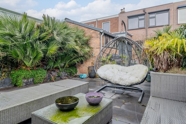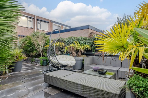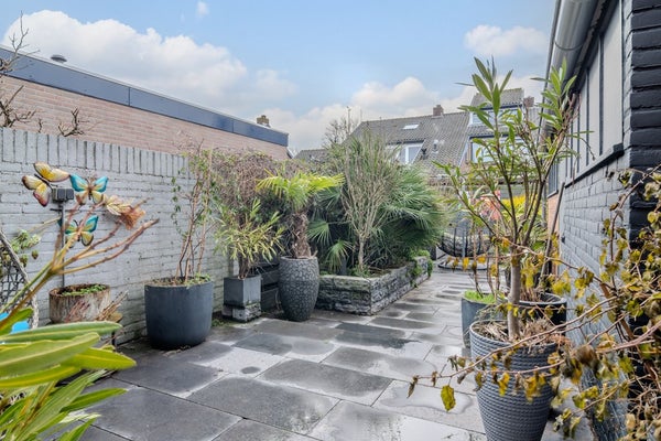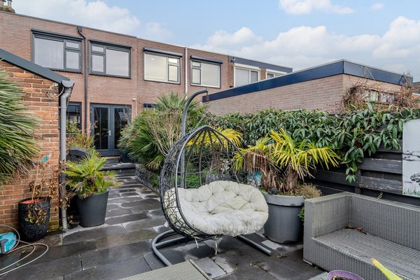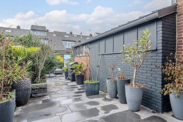 De ruime berging (3.46 x 1.96) in de achtertuin biedt ruimte voor de fietsen, opslag en op dit moment zit de wasmachine-aansluiting hier. Aan de voorzijde van de woning heb je nog een klein stukje voortuin (1.78 x 5.58) welke nu omheind is met een haag.