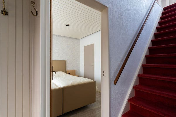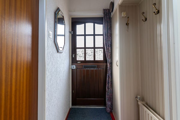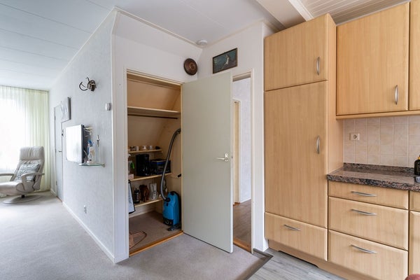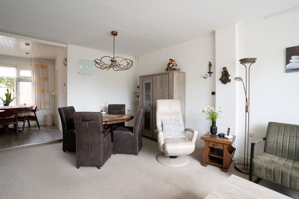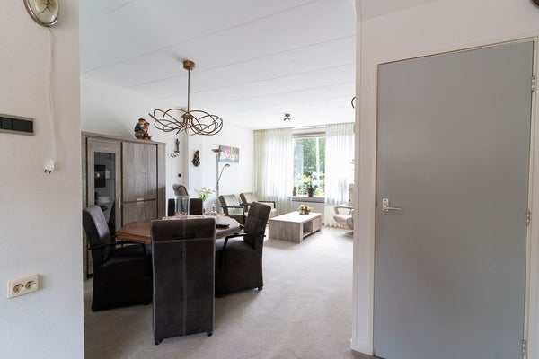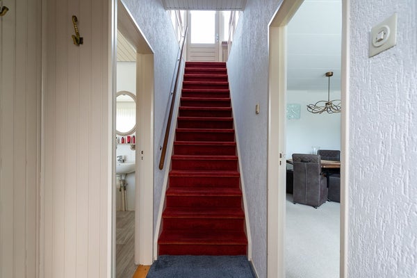 Een straatgerichte, warme en huiselijke woonkamer, een praktische kast onder de trap, en een goede lichtinval door raampartijen. De ramen aan voor- en achterzijde zijn voorzien van automatische zonwering.