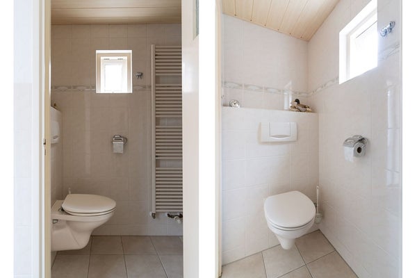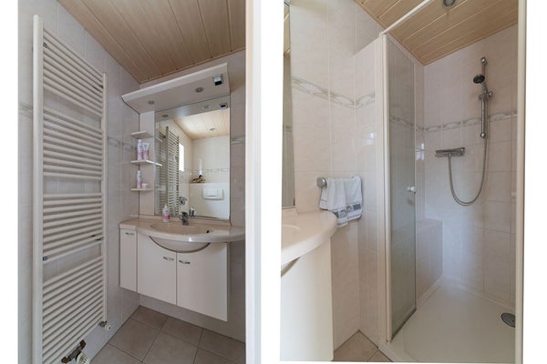 In neutrale kleurstelling, toilet, wastafelmeubel en inloopdouche.