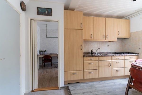 De keuken is neutraal van kleurstelling, natuurstenen werkblad en voorzien van koelkast, gaskookplaat en afzuigkap.