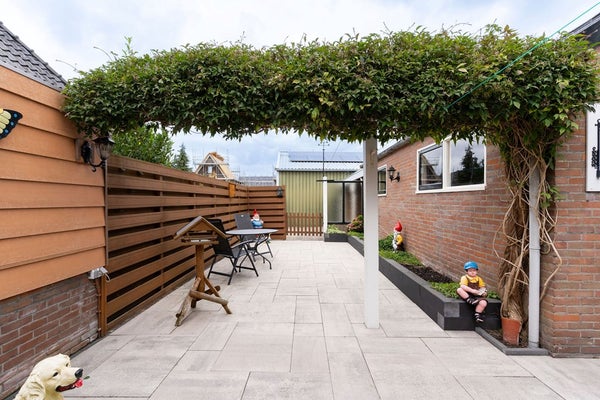 In de tuin een windscherm voor privacy en een beschut plekje. En door combinatie van border, straatwerk, schuur en grote OVERKAPPING een praktische en onderhoudsvriendelijke tuin.