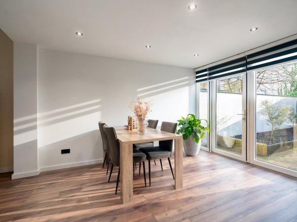 De lichte woonkamer is voorzien een laminaatvloer en staat in open verbinding met eetkamer die in de aanbouw is gesitueerd. De moderne open keuken, die van alle gemakken is voorzien: inductie, afzuigkap, vaatwasser, combi-oven en koelkast. De eetkamer, is licht en ruim van opzet en biedt via openslaande deuren direct toegang tot de tuin.