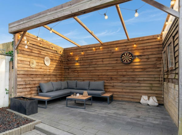 De voortuin beschikt over groen en een oprit. De achtertuin is ingericht met betegeld terras, gazon een fraaie overkapping met zitgedeelte.
