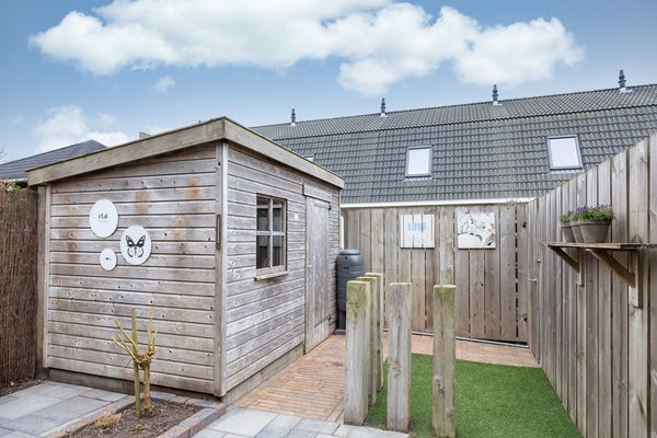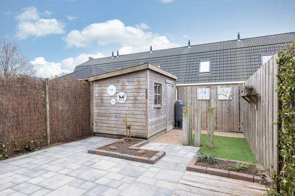 De achtertuin biedt veel privacy en is compleet met een houten bergschuur en een achterom.