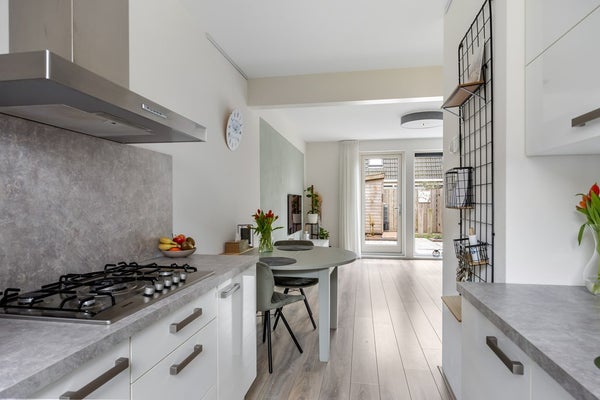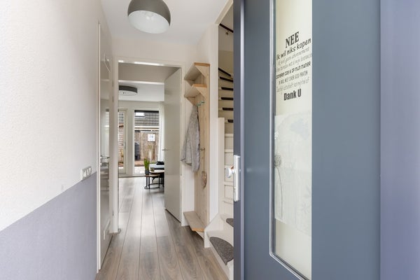 Entree, hal, meterkast, toilet en trapopgang. De ruime woonkamer is uitgevoerd in lichte kleurstellingen en voorzien van een handige trapkast met de witgoed-opstelling. De achterzijde is tuingericht en heeft veel lichtinval door het grote raam en de tuindeur. De open keuken bevindt zich aan de voorzijde en beschikt over diverse inbouwapparatuur. Op de gehele begane grond is vloerverwarming aanwezig. Middels de tuindeur is er toegang naar de achtertuin met een houten tuinschuur en een achterom.