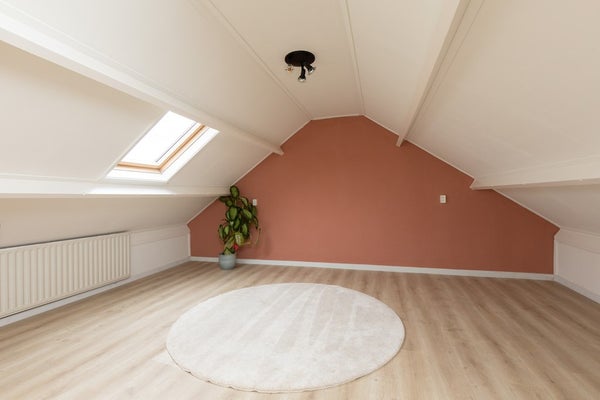 Ook de 2e verdieping is bereikbaar middels een vaste trap. Hier is een ruime zolderkamer gerealiseerd met groot dakraam. Bij de trap is een vaste kast met de cv-installatie. Aan de andere zijde bevindt zich de wasmachine-aansluiting.