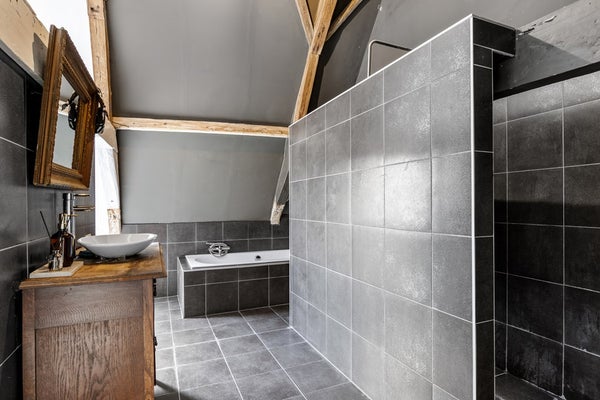 De badkamer is voorzien van een ligbad, 3e toilet, wastafelmeubel en een inloopdouche. Aan de beide zijden van het bed zijn vaste kledingkasten aanwezig.