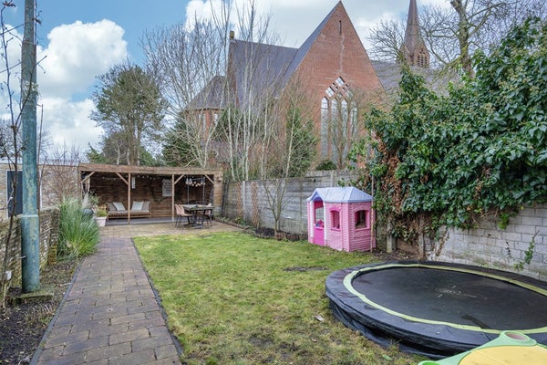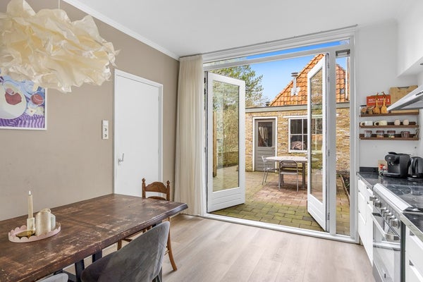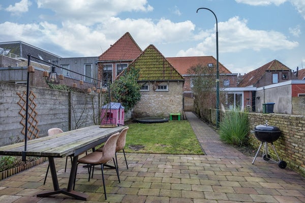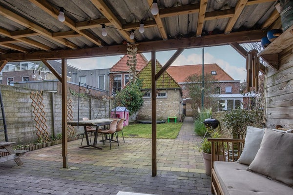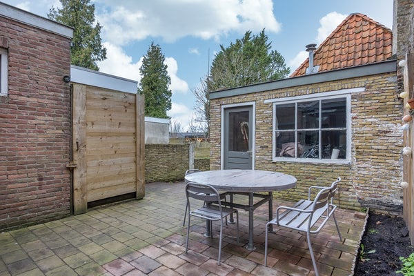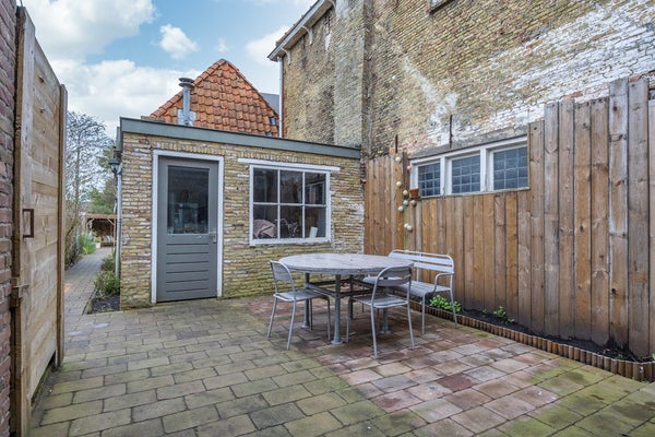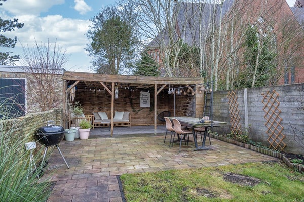 Vanuit de openslaande tuindeuren in de keuken en de achterdeur in de gang is er toegang naar het terras en de stenen berging. Achterin de tuin staat een prachtige houten veranda met een zonneterras.
