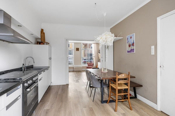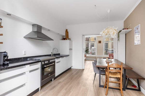 Entree, hal met oude vloertegels, trapkast, trapopgang en een toilet. De woonkeuken heeft praktische afmetingen met openslaande deuren naar de achtertuin, een keukenblok in wandopstelling en voldoende ruimte voor een grote eettafel. De keuken is voorzien van diverse inbouwapparatuur, waaronder een 5-pits fornuis. De suitedeuren scheiden de woonkeuken van de ruime woonkamer met vaste kasten. Kenmerkend voor deze beide ruimtes zijn de hoge plafonds en de grote raampartijen met veel lichtinval. De woning beschikt over een diepe achtertuin van ca. 30 meter met een stenen berging en een sfeervolle veranda.