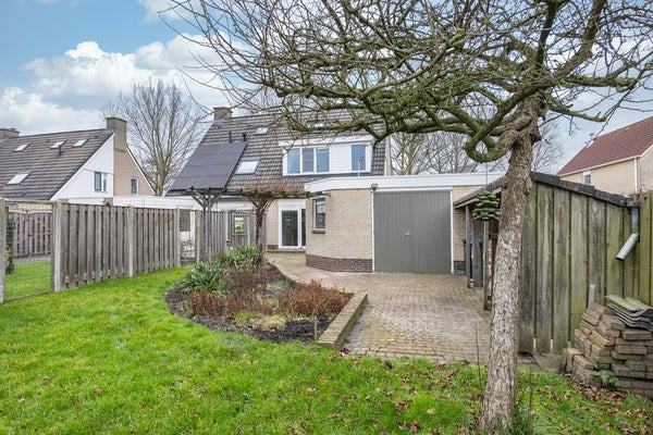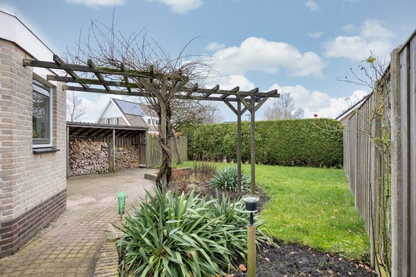 De voortuin op het noordoosten bestaat uit een border met vaste beplanting, grind met stapstenen voor de ramen en een ruime oprit aan de zijkant. De achtertuin heeft een fijne zonligging op het zuidwesten. Deze tuin is prima verzorgd en aangelegd met sierbestrating, een gazon, borders en een pergola, houtopslag en opstelplaats voor de containers.