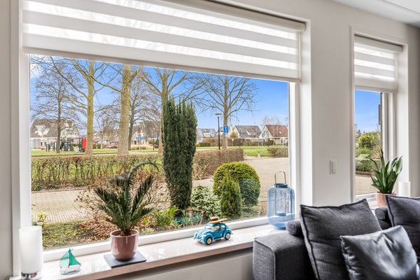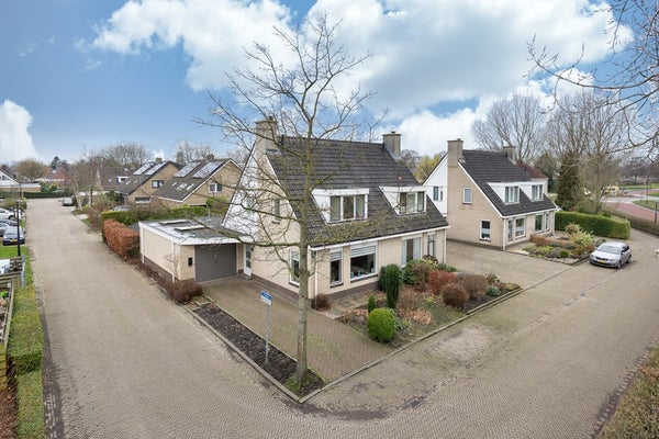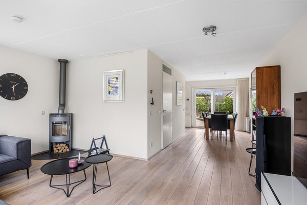 Entree, hal met meterkast, toilet met fonteintje en de trapopgang naar de eerste verdieping. De U-vormige woonkamer heeft veel lichtinval en beschikt over een ruim zitgedeelte aan de voorzijde met uitzicht over de straat en plantsoen. Met de houtkachel als extra warmtebron is het hier altijd heerlijk warm. Het eetgedeelte aan de achterzijde heeft een open hoekkeuken, voorzien van diverse inbouwapparatuur. De schuifpui bij de eethoek vormt een directe verbinding met de achtertuin. De aangebouwde bijkeuken is bereikbaar vanuit de keuken. In de bijkeuken is voldoende ruimte voor witgoed-aansluitingen. Vanuit de bijkeuken is er toegang tot de garage en de achtertuin. De garage heeft een lengte van circa 8.40 meter en is voorzien van openslaande deuren aan de voor- en aan de achterzijde. De achtertuin is gesitueerd op het zuidwesten, de voortuin op het noordoosten.