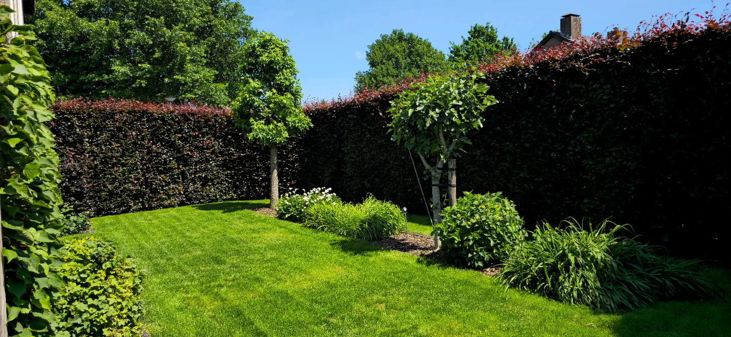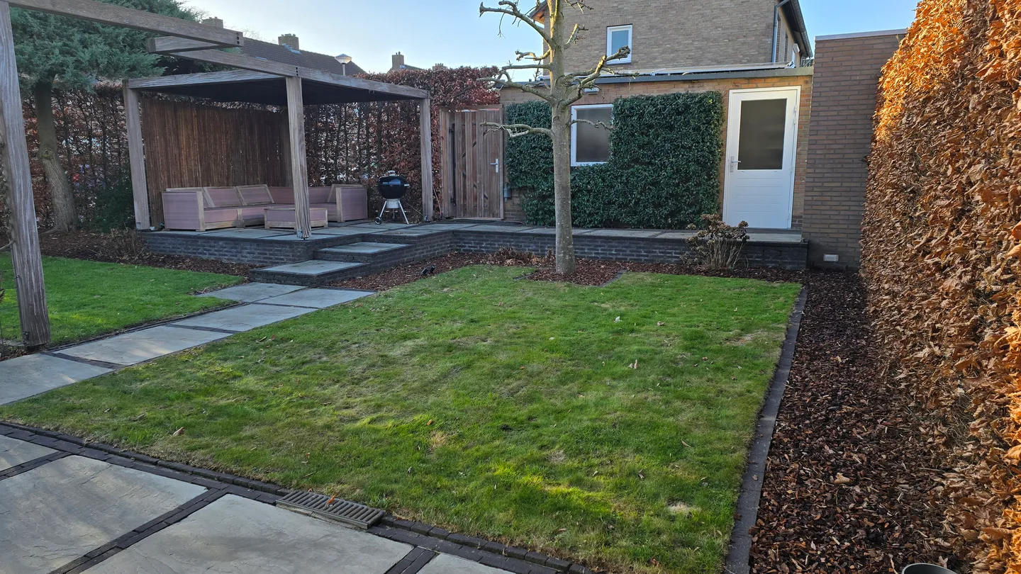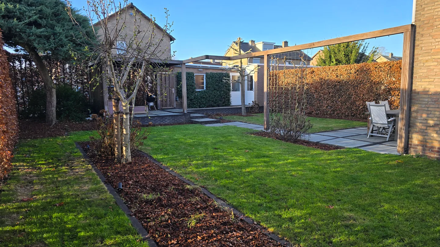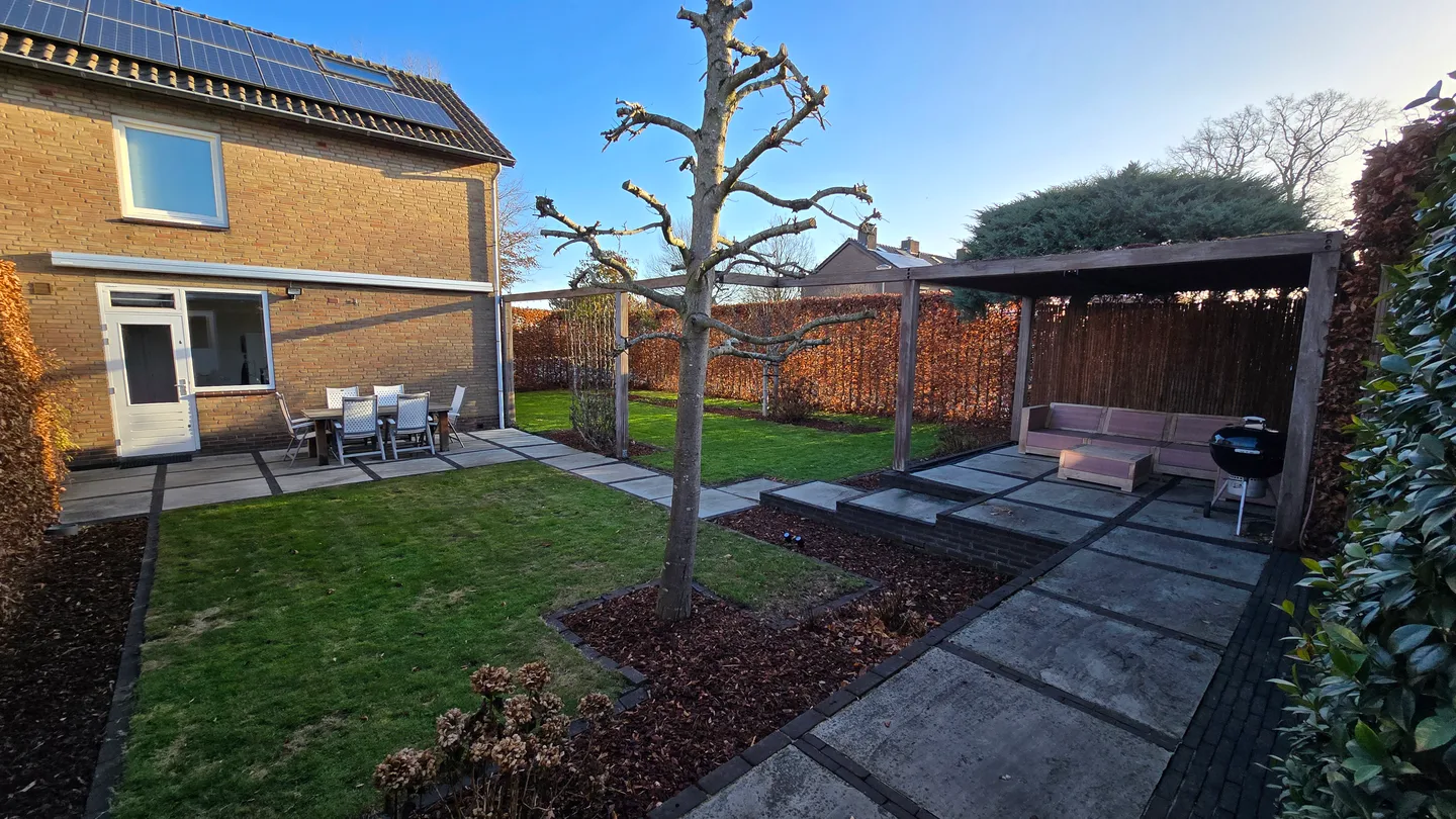 De tuin is goed omheind, heeft een garage en een overdekte zithoek. Geniet van de privacy in de grote, zuidgerichte tuin en maak gebruik van de afstandsbedieningen voor de screens, airco en luifel.