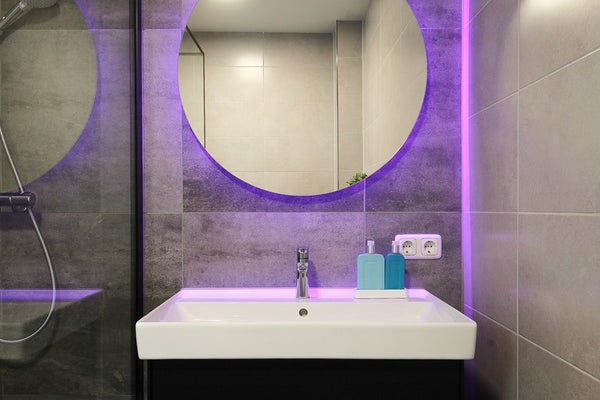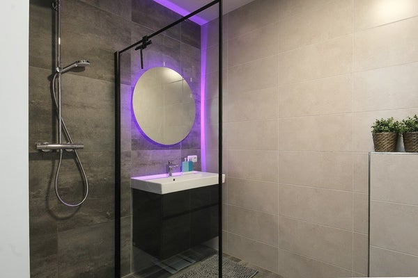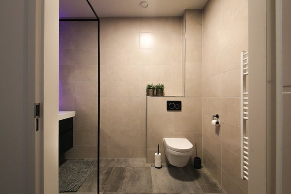 Overloop, drie slaapkamers en een moderne badkamer met design radiator, hangcloset, wastafel in meubel en comfortabele inloopdouche.