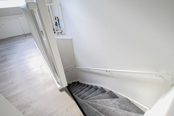 Verder in de woonkamer de open trap, ruimte voor de eethoek en een royale TV-hoek met de brede schuifpui naar de achtertuin.