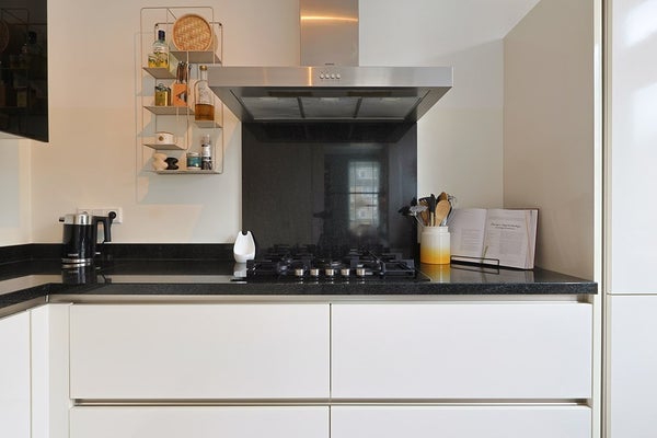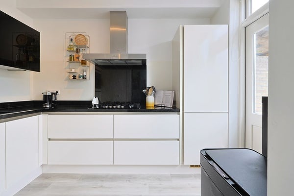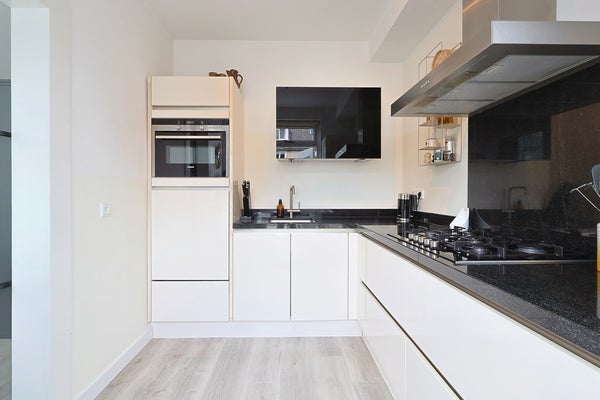 Handige stalen schuifdeur naar de moderne keuken (2019) met meubel in een hoekopstelling, voorzien van onder andere een gaskookplaat met afzuigkap, oven, koel-, vriescombinatie en een vaatwasser (2024). Eveneens een loopdeur naar de tuin.
