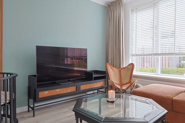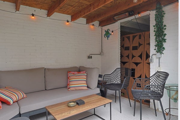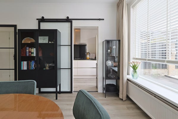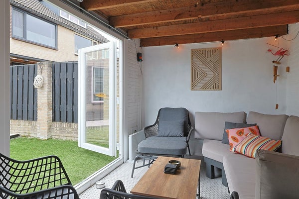 In een deel van de oorspronkelijke berging is de sfeervolle tuinkamer met openslaande tuindeuren gerealiseerd, waardoor u hier zowel bij zonnig als minder mooi weer comfortabel van de tuin kunt genieten.