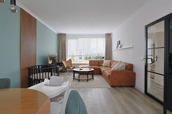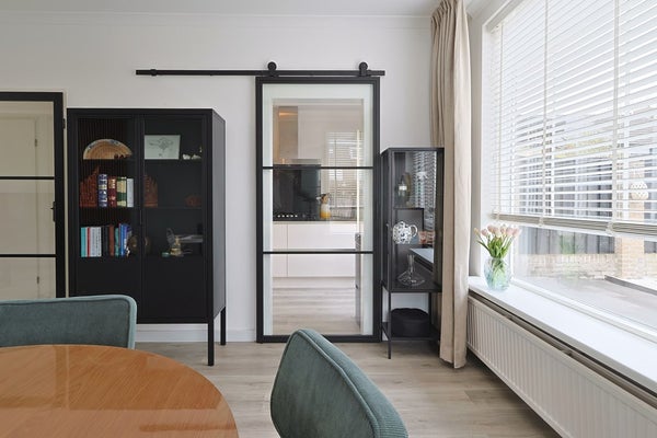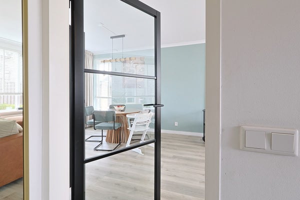 Moderne stalen deur naar de woonkamer met grote raampartijen aan voor- en achterzijde en een loopdeur naar de achtertuin. Keurige afwerking met een PVC-vloer en strak gestucte wanden en plafonds.