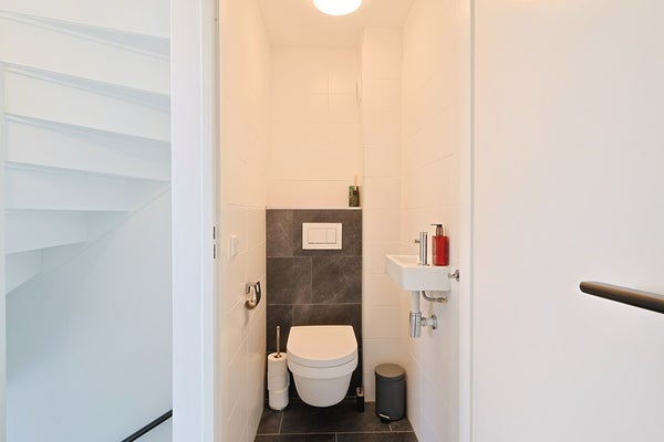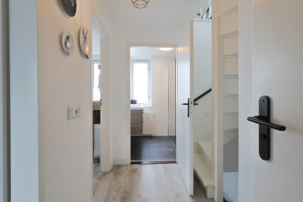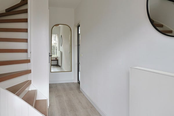 Entree met hal, moderne meterkast, trapopgang, trapkast en toiletruimte.