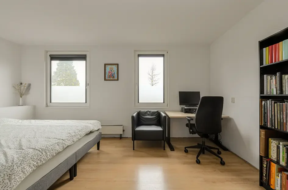 De eerste verdieping heeft onder meer twee slaapkamers, waarbij de achterzijde een inloopkast heeft. De modern uitgeruste badkamer bevat een inloopdouche en dubbele wastafel. De tweede verdieping biedt een ruime slaapkamer met Velux dakraam en praktische berging. Met eigen oprit, stenen berging en nabij voorzieningen zoals scholen en winkelcentra, is dit de perfecte gezinswoning.