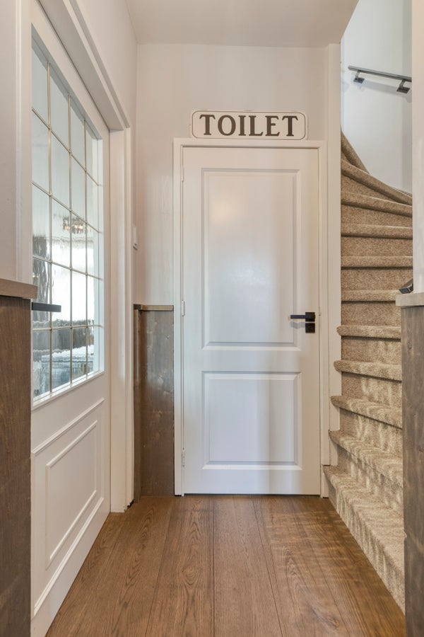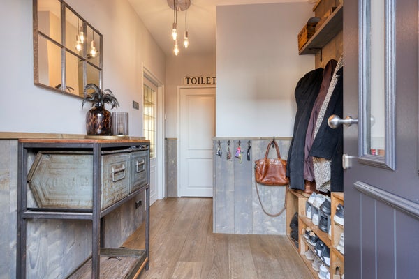 Een royale entree/hal met een garderobenis en een robuuste voordeur met trippel glas. Via de hal zijn het moderne vrijhangend toilet en de verrassend ruime woonkamer te bereiken.