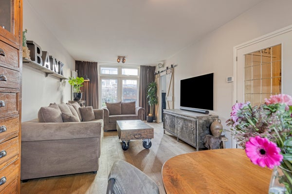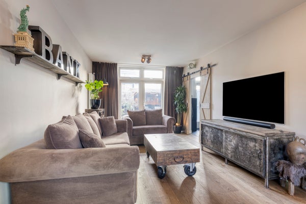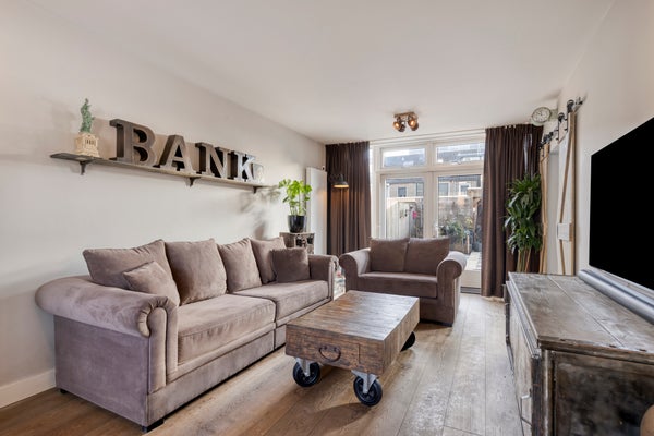 De sfeervolle woonkamer heeft een groot voorgevelraam, een fraaie glazen achtergevel met openslaande tuindeuren, een designradiator en staat in semi-open verbinding met de eigentijdse inbouwkeuken. Hierdoor ontstaat er een prettig ruimtelijk gevoel.