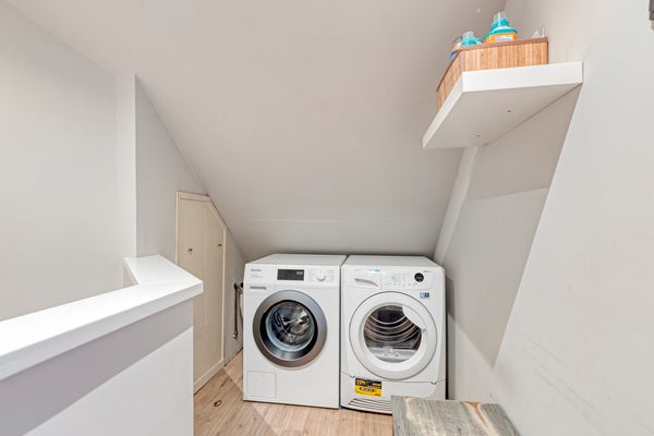 De 2e verdieping (houten constructievloer) is bereikbaar middels een vaste trap, bestaat uit een overloop met een wasmachine-/drogeraansluiting en een riante 4e slaap-/werkkamer.