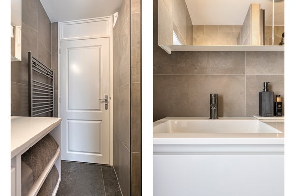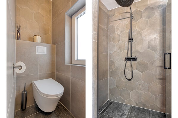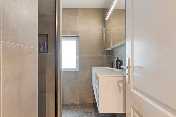 De eigentijdse badkamer (2024) met een voorgevelraam, is voorzien van een praktisch wastafelmeubel, een vrijhangend toilet en een luxe inloopdouche.