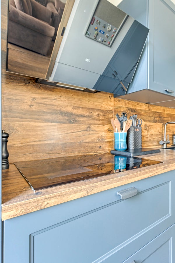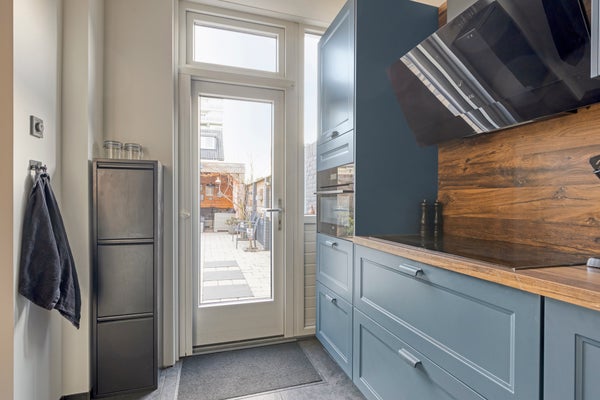 De aangrenzende, stoere, halfopen inbouwkeuken met een loopdeur naar de diepe tuin, ligt aan de achterzijde. Deze eigentijdse, complete L-vormige inbouwkeuken (2023), is uitgerust met een design afzuigkap, een inductiekookplaat, combi oven, vaatwasmachine, een handige Selsiuz kraan, een koelkast en een 3-laden diepvriezer.