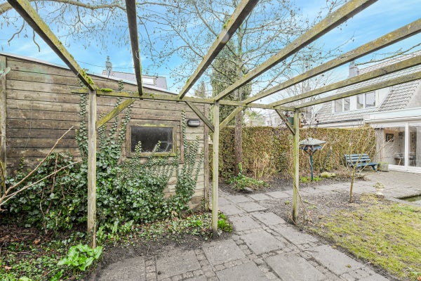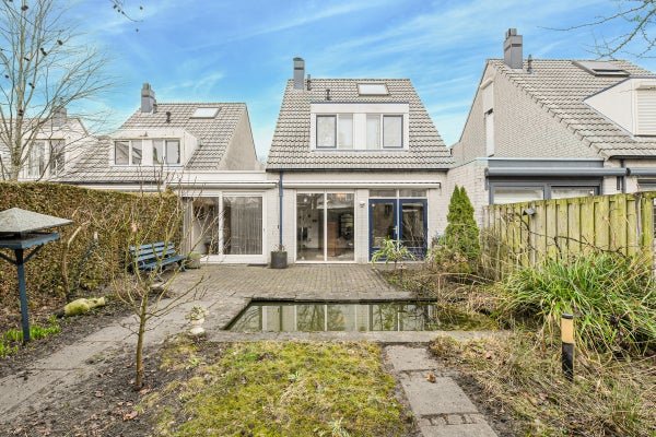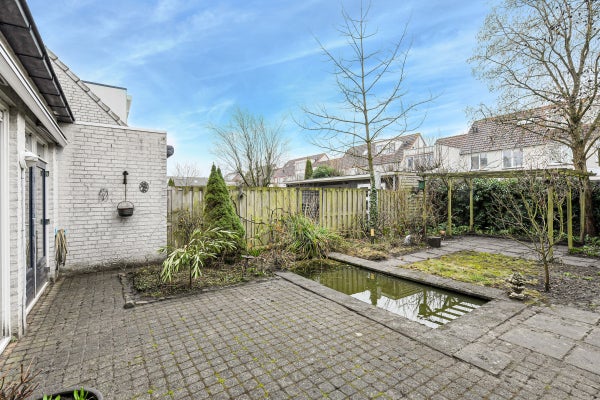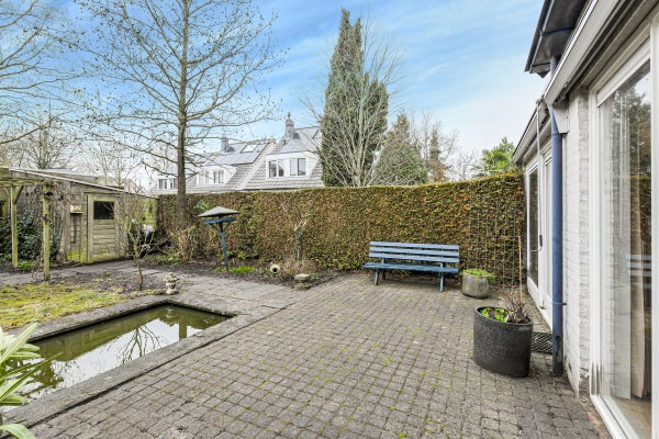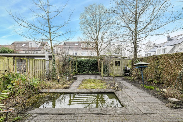 De zonnige achtertuin (ca. 13.70 meter diep) ligt op het zuidwesten, biedt veel privacy en is voorzien van een zonneterras, vijver, vaste beplanting en een houten berging.