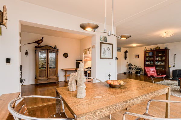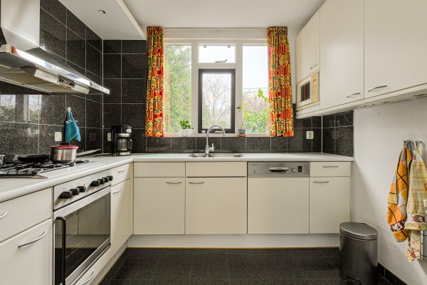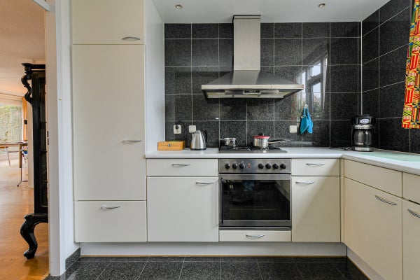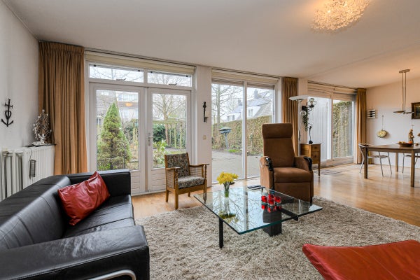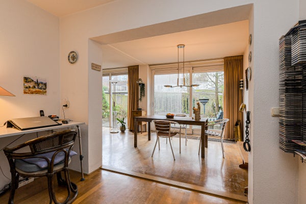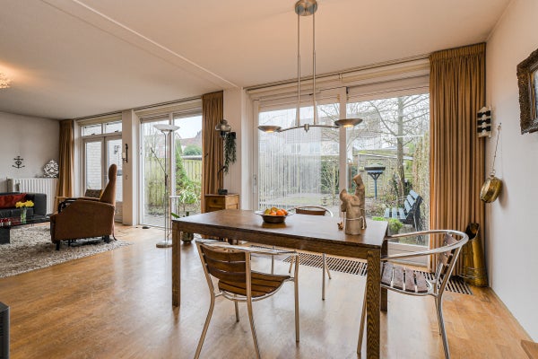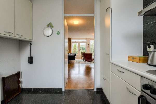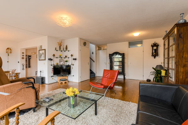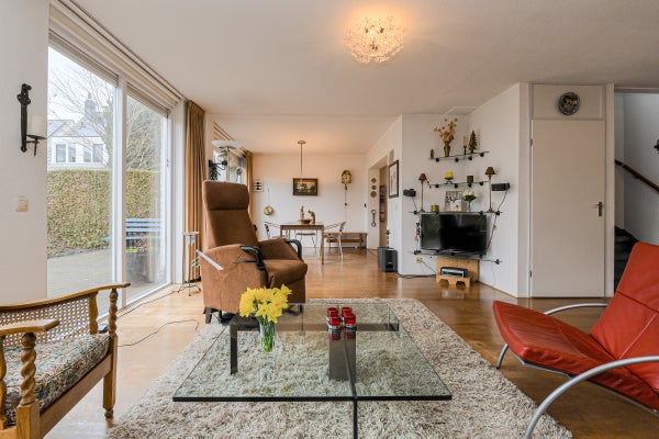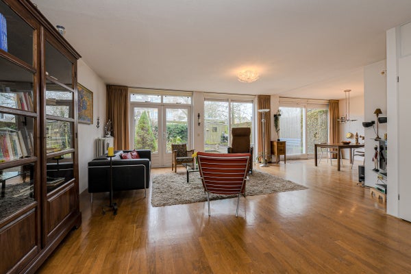 De royale, tuingerichte woonkamer (ca. 42 m²) is voorzien van eiken parketvloer, trapopgang, trapkast, studeerhoek (ca. 3.03 x 2.43 m), twee convectorputten en een schuifpui naar de achtertuin. De dichte keuken (ca. 2.75 x 2.63 m) ligt aan de voorzijde en beschikt over een hoekopstelling met kunststof werkblad, spoelbak, tegelvloer en diverse inbouwapparatuur: gaskookplaat, afzuigkap, magnetron, vaatwasser, oven en koelkast.