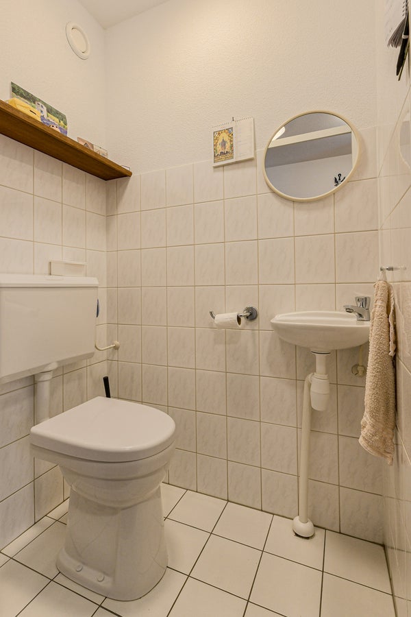 Overloop met trapopgang naar de tweede verdieping en een separaat betegeld toilet met staand closet en fonteintje.