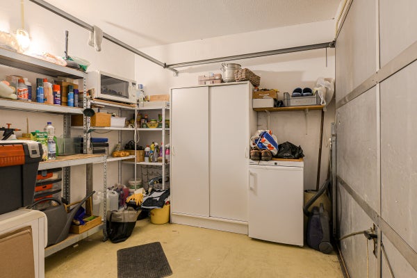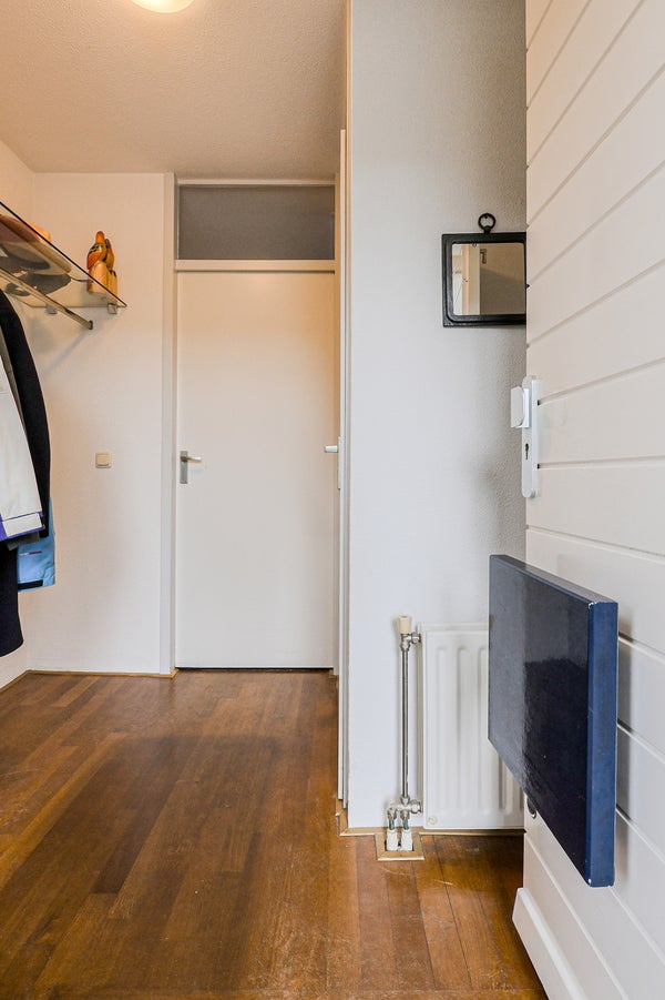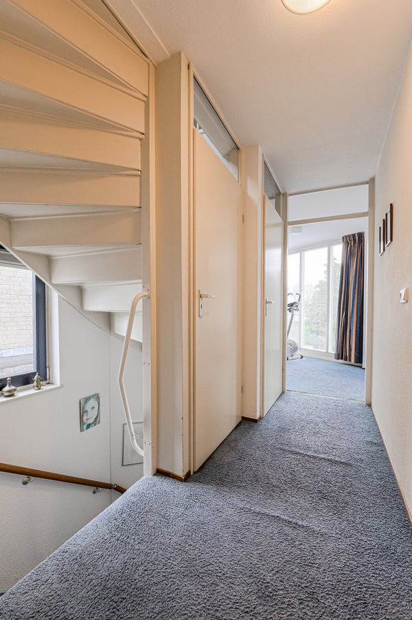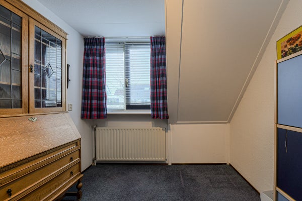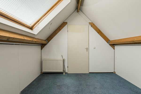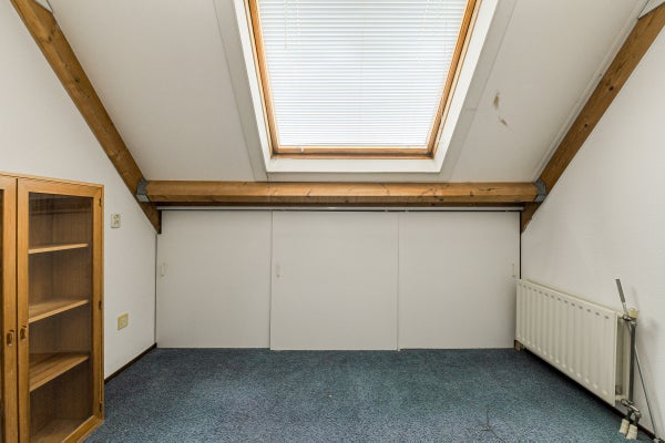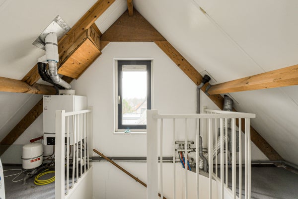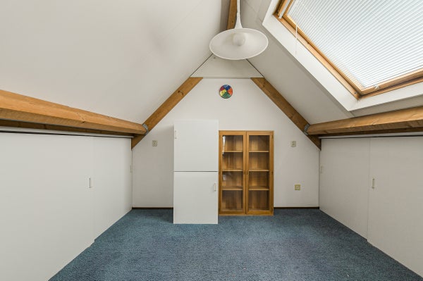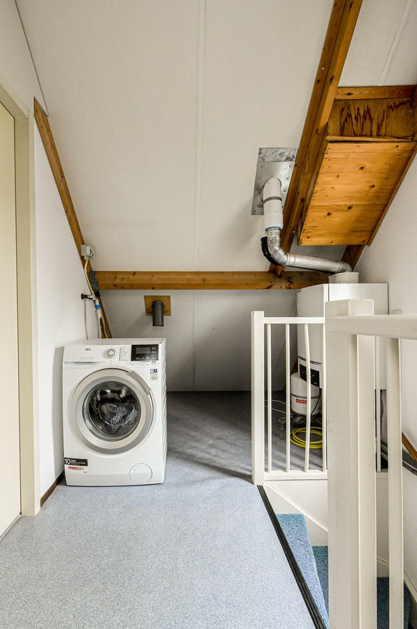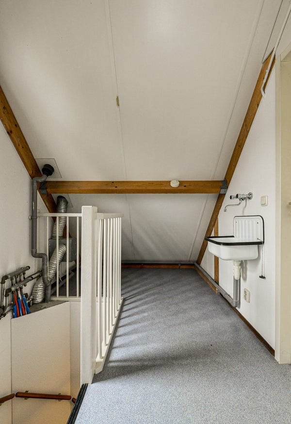 Vaste trap naar de voorzolder met opstelplaats voor de combiketel, uitstortgootsteen en aansluitingen voor wasmachine en droger. Aansluitend een zolderslaapkamer met daktuimelraam en bergruimte achter de knieschotten.
