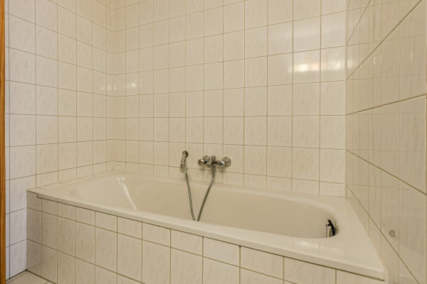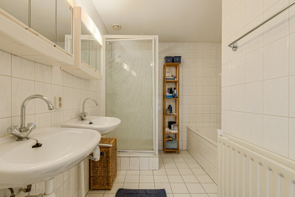• Deels betegelde badkamer (ca. 6 m²)) met douche, ligbad en twee wastafels met spiegel en spots.